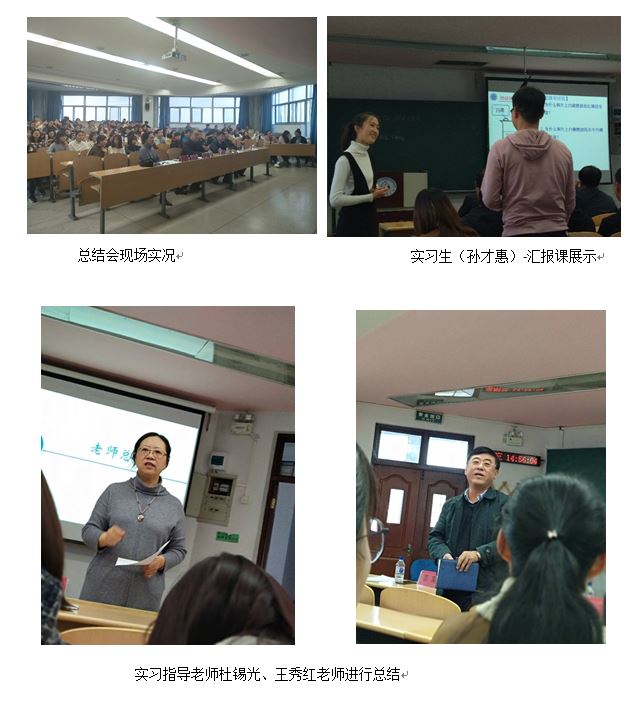 会上,实习生代表全馨铭同学进行了应用实践学习总结,张嘉男同学进行班主任工作介绍及相关反思,孙才惠和李佳忆同学分别进行了《燃烧与灭火》、《物质的分离方式—萃取》的授课,王玉芳同学和大家分享了实践归来的感想与心得。随后同学们就相关实习、就业问题进行了交流讨论。最后王秀红老师和杜锡光老师对本次大会和实习情况进行了全面而精彩的总结。
