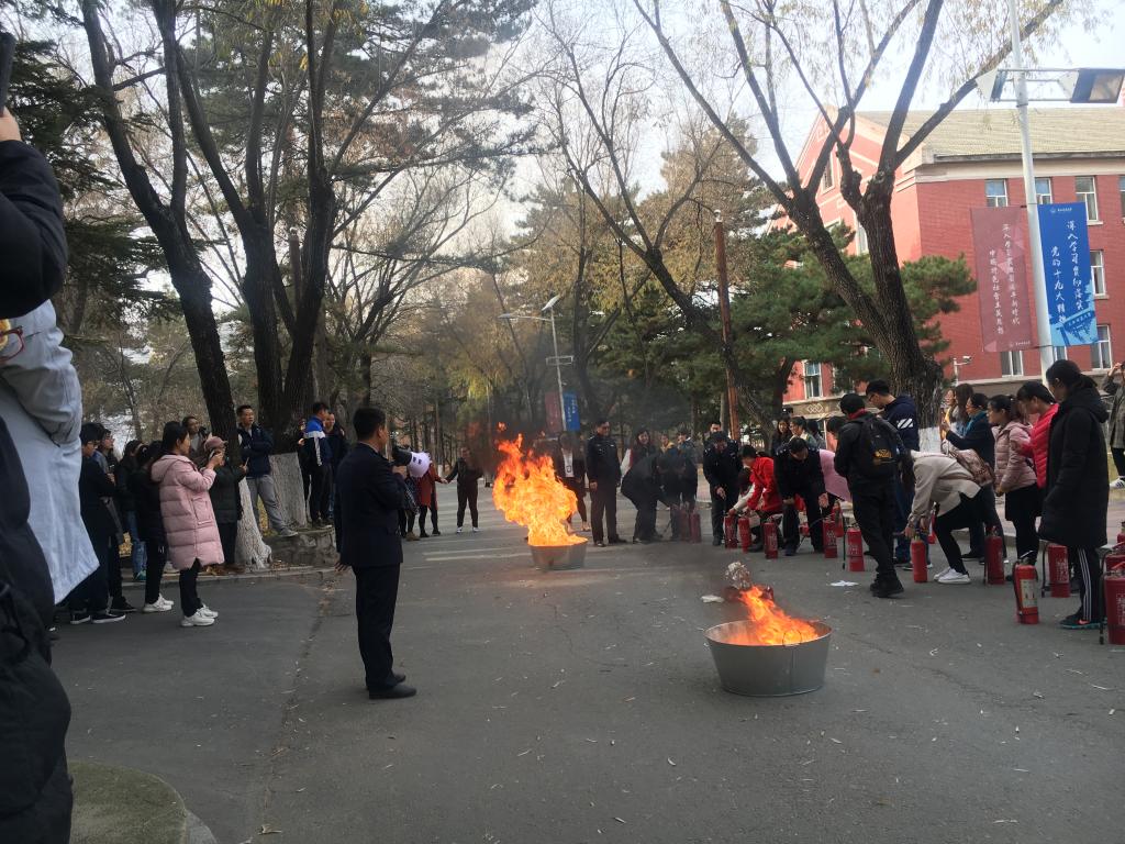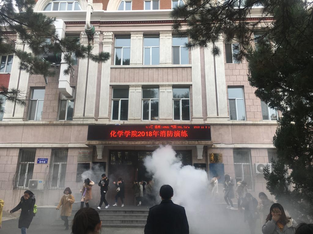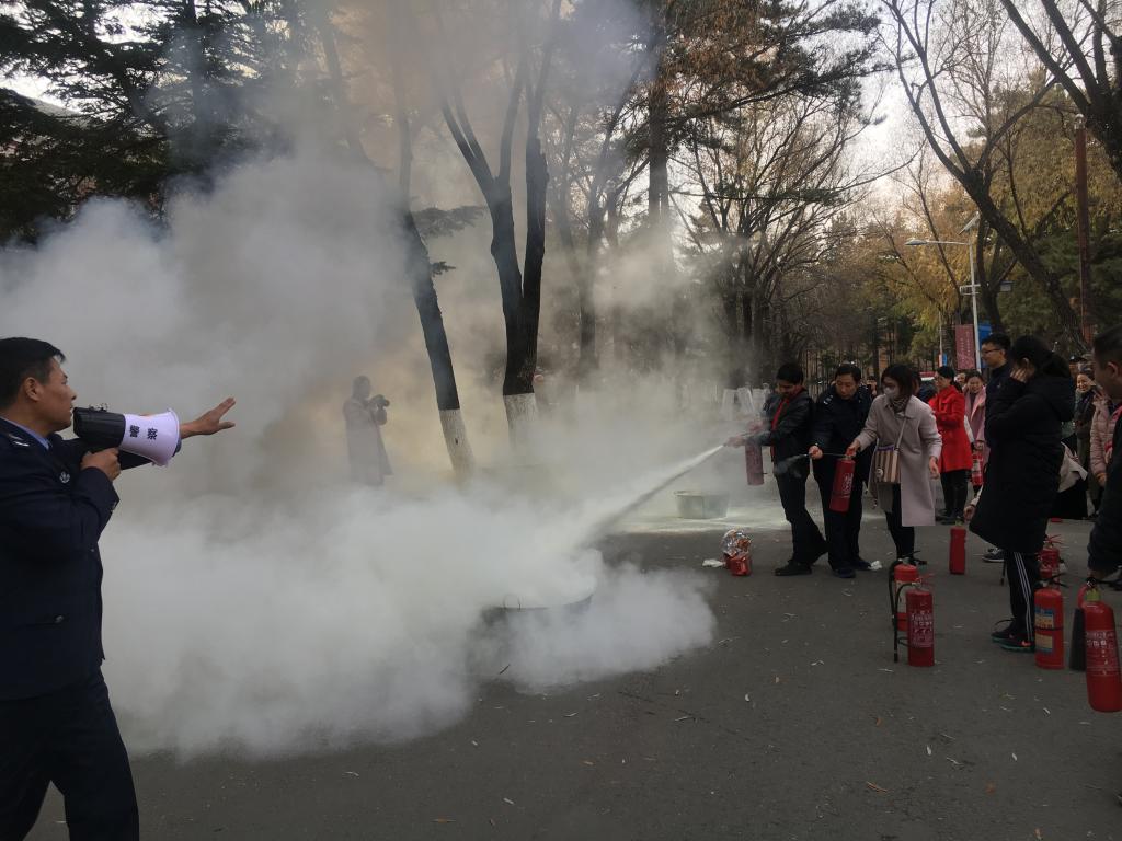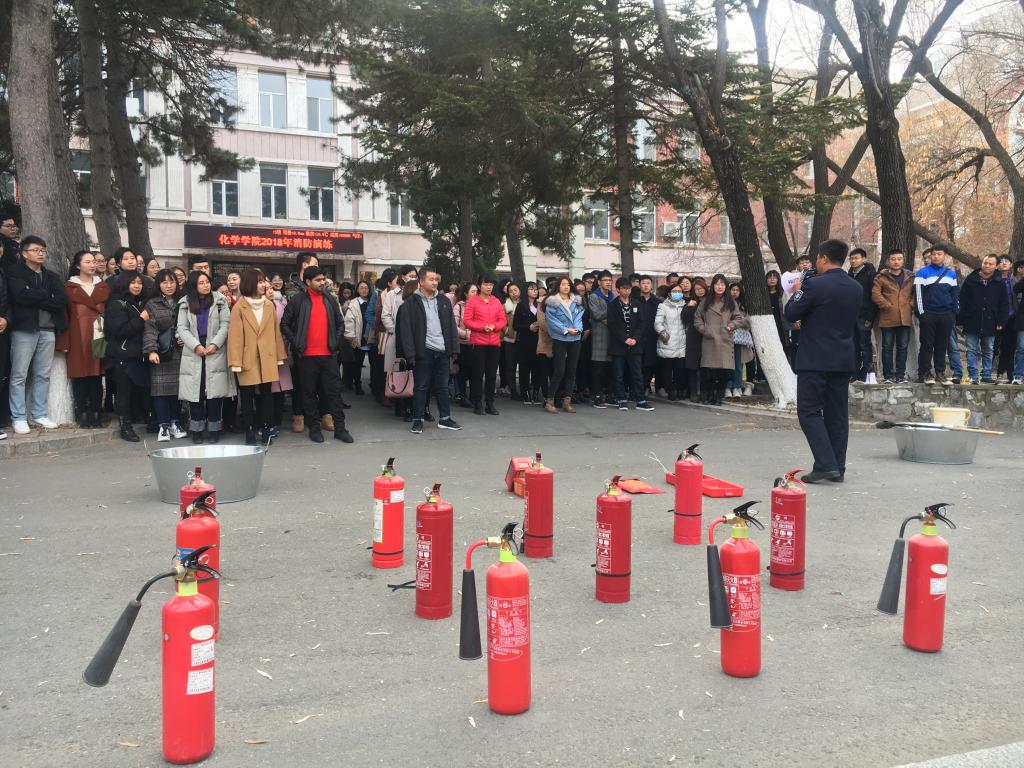 本次演练分两个部分内容:先是学院自行组织逸夫科学馆及化学楼的师生进行疏散模拟演练;随后师生们在保卫处工作人员的指导下进行了灭火实操演练。