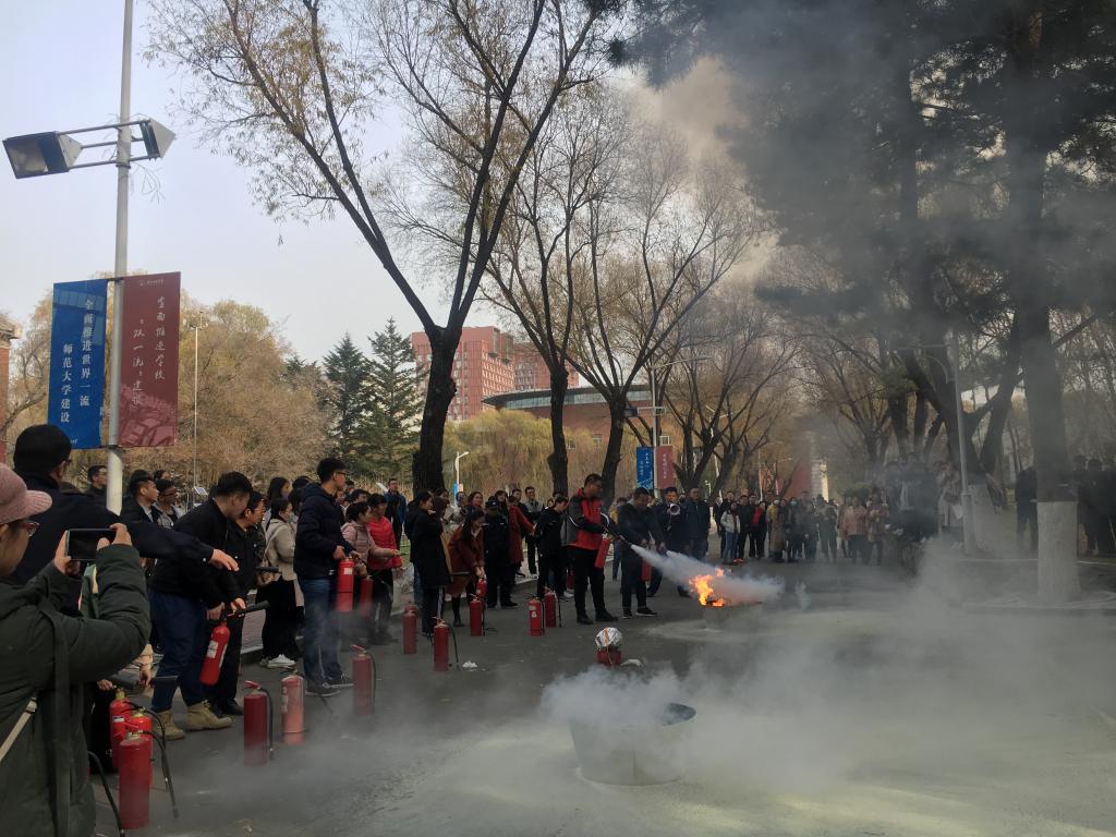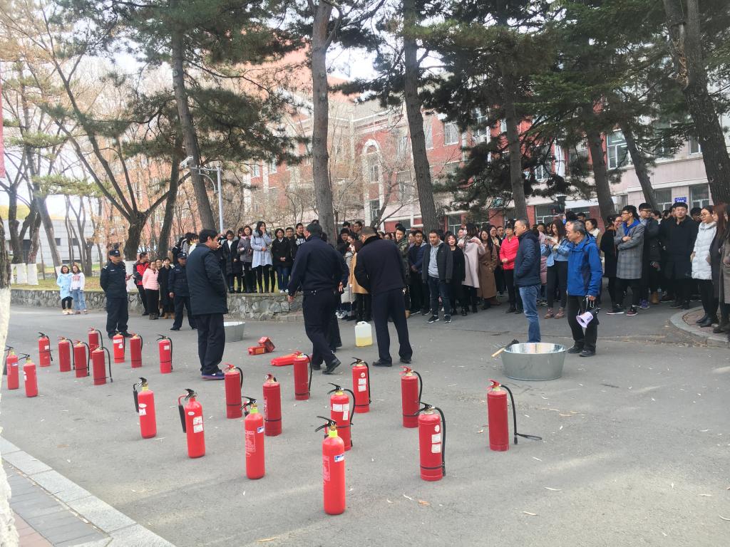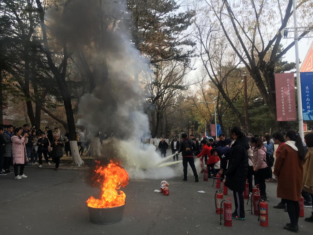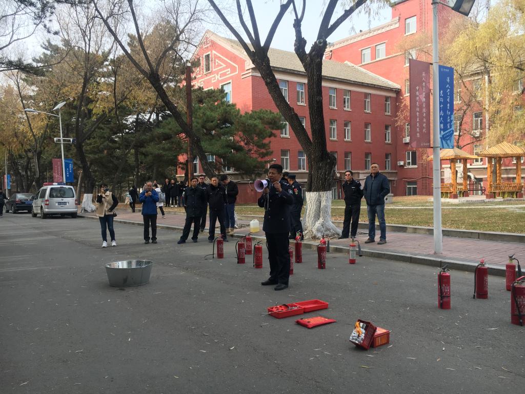 本次演练分两个部分内容:先是学院自行组织逸夫科学馆及化学楼的师生进行疏散模拟演练;随后师生们在保卫处工作人员的指导下进行了灭火实操演练。