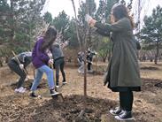 同学们下车之后,先由植树工作者为我们讲解了植树流程,接着同学们两两分成一组,分别在两片地上大展拳脚,一人扶着树,一人拿锹进行填土。树干比较沉,女生们拿着比较吃力,大家却仍在坚持着。在我们离开之后,林业工作者们会立即下支架,固定住这些小树苗。我们在整个过程中也体会到了林业工作者们的辛苦与不易,向他们致敬。