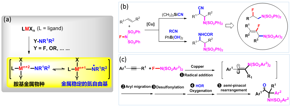 图2:利用高价金属的氧化还原异构化,在温和条件下产生“金属稳定氮自由基”,高选择性实现自由基胺化反应。(a)金属稳定的氮自由基环中间体,(b)分子间烯烃/联二烯的胺化双官能团化反应,(c)炔烃的胺化多官能团化反应。
