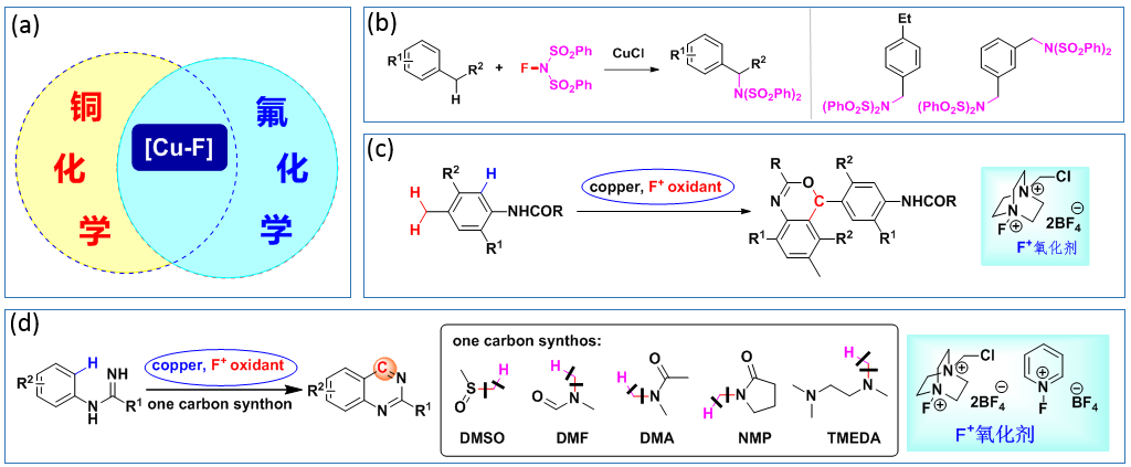 图3:利用一价铜和氟正离子的催化体系,高选择性实现几种C–H键的活化,构建了系列重要的含氮化合物。(a)一价铜和氟正离子的催化体系现场生成三价铜氟活性物种,(b)苄位sp3 C–H的胺化反应,(c)顺次活化sp2、sp3 C–H键合成苯并噁嗪,(d)顺次活化sp2、sp3 C–H键合成喹唑啉。
