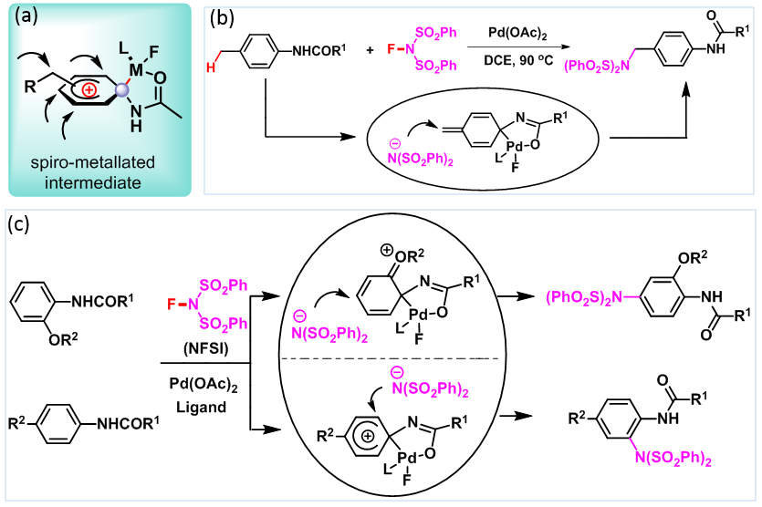 图1:利用“高价金属原位进攻-亲核胺化”新思想,高选择性实现各种C–H键的胺化反应。(a)现场生成的金属杂螺环中间体,(b)导向基对位苄位sp3 C–H的胺化反应,(c)导向基邻位或对位芳烃sp2 C–H的胺化反应。