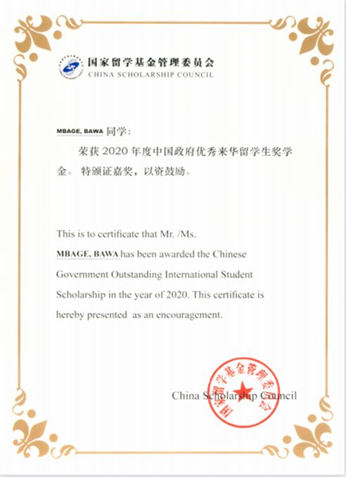 中国政府优秀来华留学生奖学金” 自2015年开始评选,是教育部面向中国政府奖学金院校本科二年级(含)以上或研究生二年级(含)以上的全日制学历生开展的一项年度优秀留学生评选,旨在奖励和表彰知华友华、品学兼优的来华留学生。该奖项经教育部组织专家对推荐人的学业情况、科研能力和在华表现进行评审后产生。因申请人数众多、评审要求严格,被视为中国政府授予来华留学生的最高荣誉。此次评选我校共有包括BAWA等三名留学生获此殊荣,2020年,该三名留学生在学习、科研、社会服务、文化传播和抗击疫情等各个领域表现突出,是我校留学生的优秀代表。