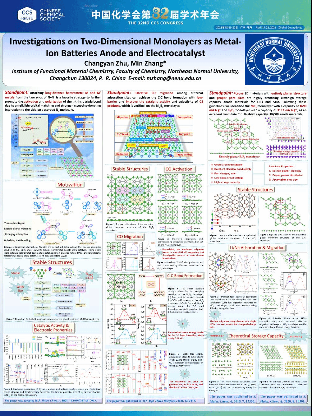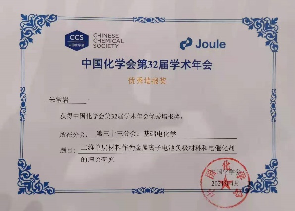 yl88858永利集团2019级博士研究生朱常岩投递在第33分会场“基础电化学”,主题为“二维单层材料作为金属离子电池负极材料和电催化剂的理论研究”的墙报被评为大会优秀墙报。