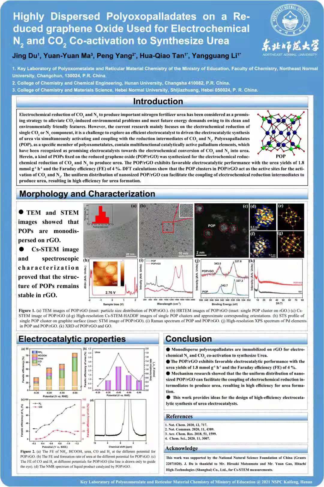 yl88858永利集团2019级博士研究生都京主题为“高度分散的还原氧化石墨烯负载的钯多酸用于电催化N2和CO2共活化产尿素”的墙报和2020级博士研究生赵聪聪主题为“磷钼酸负载Pt高效电催化硝基苯氢化制苯胺的理论研究”被评为会议优秀墙报。