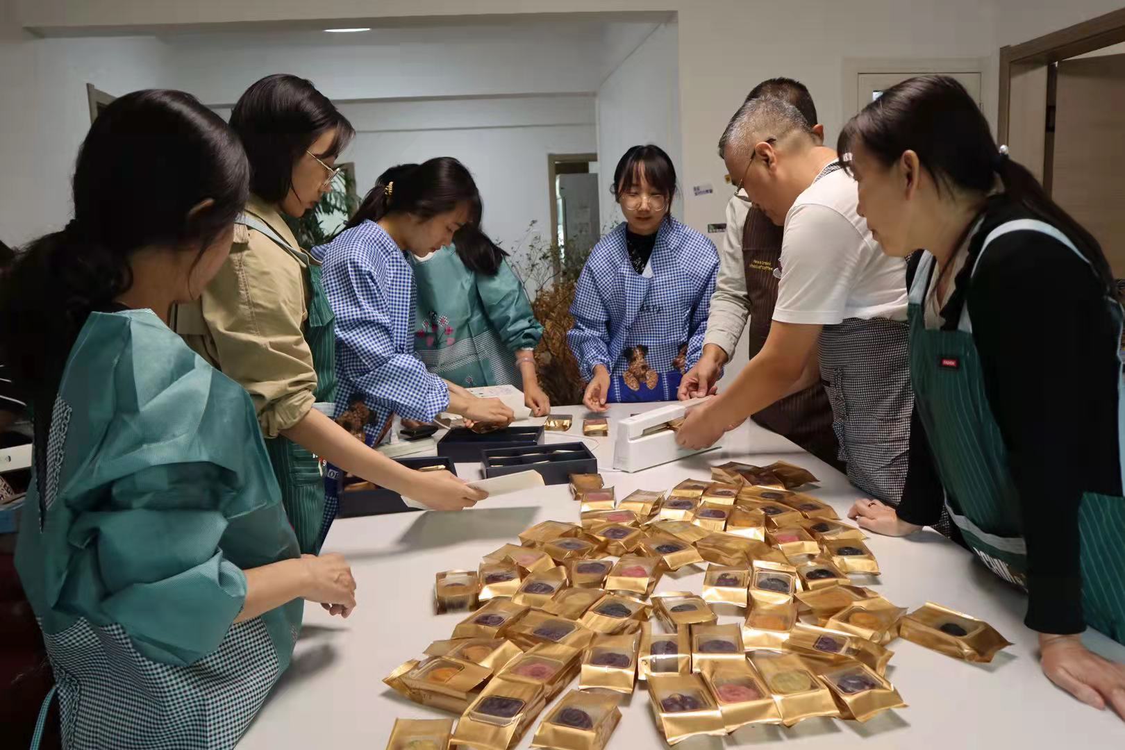 月饼模具、面粉、馅料……当天下午,活动室内,制作月饼的材料琳琅满目。月饼的制作较为简单,且味道清甜可口,造型美观。在专业烘焙师的帮助下,各位教工们戴上手套,开始兴致勃勃地学做月饼。大家有的揉面团,有的包馅,有的压模,说说笑笑间,分工有条不紊。不一会儿,一只只精美的月饼在教工们手中诞生。