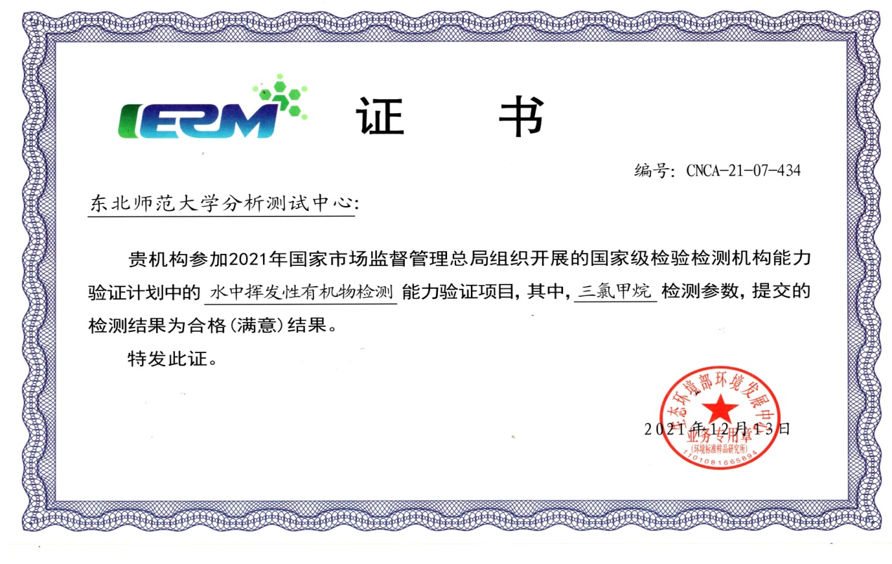 近日,我校分析测试中心在2021年国家市场监管总局组织的“水中挥发性有机物检测”国家级检验检测机构能力验证项目(A类)中获得合格(满意)结果。