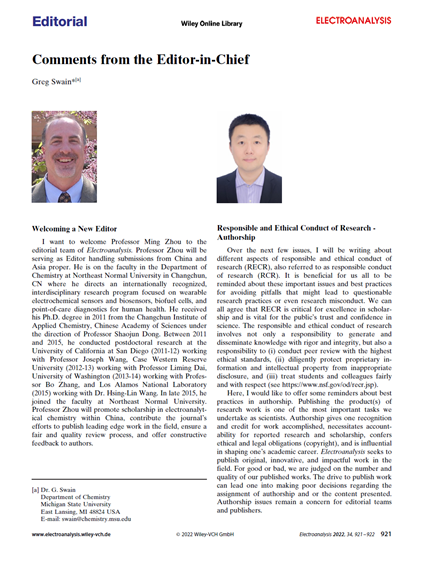 图3 Ming Zhou教授应邀担任Wiley出版社旗下国际知名学术期刊《电分析(Electroanalysis)》副主编