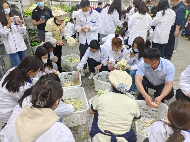 在北苑餐饮服务中心工作人员的带领下,两个党支部的学生党员按专业分为三组,在蔬菜库里分别负责芹菜,大头菜和菜花的摘选工作。同学们认真聆听食堂工作人员的细心指导,学生党员们很快熟练掌握摘菜技巧,分工有序、配合默契,顺利完成了既定的摘菜工作。随后,在饮食服务中心党支部成员的带领下,同学们参观了北苑食堂厨房,此时食堂工作人员正在准备面点,在工作人员的带领下同学们也参与其中体验了美食的制作过程。
