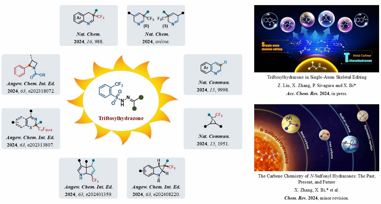 鉴于课题组在单原子骨架编辑领域取得的显著进展,领域知名学者—加州大学伯克利分校Richmond Sarpong 教授和 芝加哥大学Mark Levin教授,邀请课题组在美国化学会《Accounts of Chemical Research》上撰写综述文章,系统介绍课题组在这一领域取得的研究成果(Acc.Chem.Res.2024,in press),这是课题组近五年第三次在这一化学领域重要期刊上发表综述文章(Acc.Chem.Res.2022,55,1763;2020,53,662)。同时,获邀在美国化学会《Chemical Reviews》撰写综述文章,系统介绍了磺酰腙卡宾化学的发展历史、现状及未来趋势(Chem.Rev.2024,minor revision)。