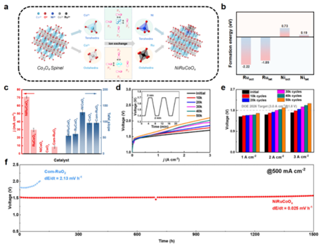电解水技术可绿色高效制取氢气,作为电解水的阳极半反应,氧气析出反应(OER)高度依赖铱基贵金属催化剂。过渡金属氧化物电催化剂在酸性条件下进行OER时存在不稳定性问题,极大限制了它们在质子交换膜电解水(PEMWE)中的应用。为应对该挑战,团队将Co3O4中的部分Co替换为Ni和Ru调整其尖晶石结构(如图1),充分利用Co3O4中四面体和八面体位点之间的协同作用增强OER电催化活性和稳定性。结果表明,Ru是双原子氧机制中的活性位点,而Ni则稳定晶格氧和Ru−O键。NiRuCoOx催化剂表现出极低的OER过电位(166 mV@10 mA cm−2)。在PEMWE器件上达到3 A cm−2的电流密度仅需1.72 V,满足美国能源部(DOE)设定的2026目标(<1.8 V@3 A cm−2)。PEMWE装置可稳定运行1500小时,性能衰减率仅为0.025 mV h−1。该工作为开发低成本高效酸性水电解催化剂提供了可行借鉴,相关成果以“Tailoring octahedron-tetrahedron synergism in spinel catalysts for acidic water electrolysis”为题,发表于国际知名期刊J. Am. Chem. Soc.;论文第一作者为我校yl88858永利集团博士研究生霍孟田,通讯作者为我校yl88858永利集团常进法教授、邢子豪副教授以及美国中佛罗里大学杨阳教授。相关技术已经申请中国专利,申请号:202410593475X。此外,团队在水电解方面的相关系列工作先后发表于Small, 2025, 13, 2412729; Nano Res. 2025, 18(3), 94907243; ChemCatChem, 2025, 17(6), e202401950, Green Carbon, 2024, 2 403-404等。