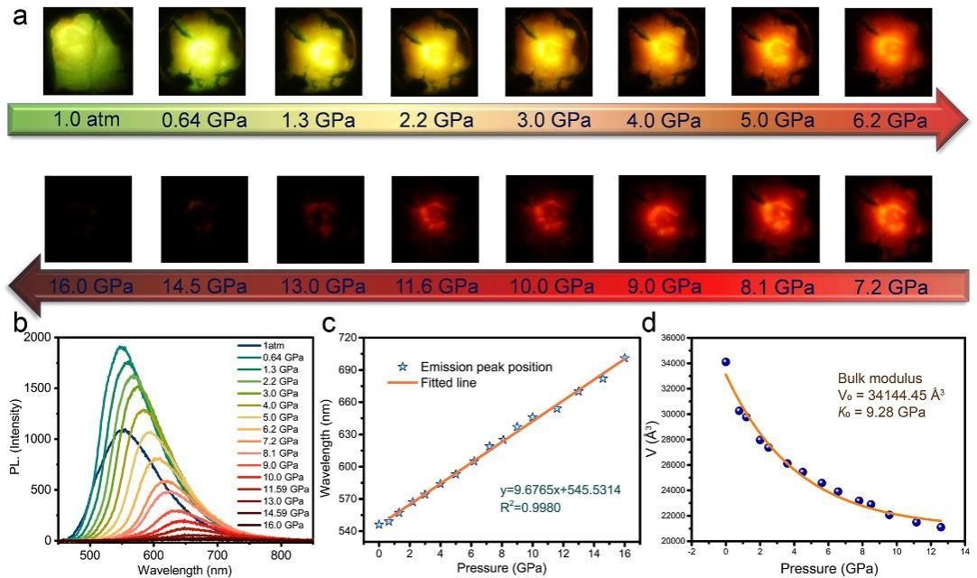 压电致变色材料表现出与压力相关的发光变化,在机械传感器、防伪和存储器件中具有广泛的应用前景。晶体多孔材料在高度可调发光的压致变色方面得到了广泛的研究。然而,在大压力范围内实现可逆和高对比度的发射响应仍然是一个挑战。为应对该挑战,团队通过π -π堆叠相互作用组装了首例具有弹簧结构的多孔分子笼π-堆积超分子骨架,其光致发光波长与压力呈线性相关,且发射差高达154 nm,响应极限高达16 GPa,优于迄今为止报道的晶态多孔材料。通过计算表明,这种出色的压电荧光变色现象是由于π-π相互作用诱导的结构可控收缩以及具有弹性的孔弹簧结构。相关成果以“Piezofluorochromism in Hierarchical Porous π-stacked Supermolecular Spring Frameworks from Aromatic Chiral Cages”为题,发表于国际知名期刊Angew. Chem. Int. Ed.;论文第一作者为崔冬旭博士,通讯作者为我校yl88858永利集团孙春义、王新龙教授以及吉林大学邹博教授。此外,团队在手性芳香笼构筑及能源气体多组分一步吸附分离等方面的相关系列工作先后发表于Nat. Commun. 2022, 13, 4011; Adv. Funct. Mater. 2025, 2501580等。