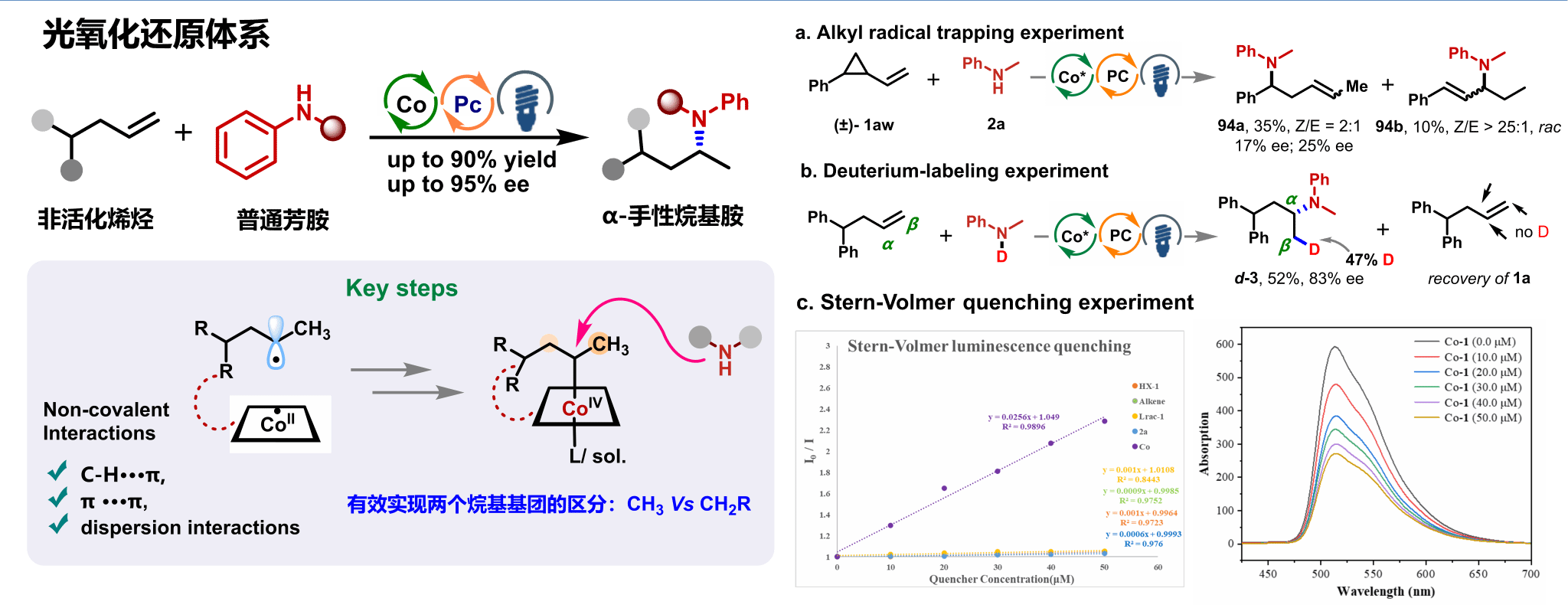 为了进一步实现极具挑战性的非活化烯烃的不对称自由基氢胺化反应,解决二烷基碳自由基立体化学控制的关键难题,研究团队创新性地融合了金属/光协同催化与自由基-极性交叉策略,提出光钴协同催化的“高价金属亲核取代”新机制。该过程利用手性催化剂与碳自由基之间的弱相互作用,精准识别并引导二烷基自由基形成C–M键,进而在温和的光氧化条件下生成关键的高价烷基钴中间体。光催化体系的引入,不仅避免了传统方法中化学计量氧化剂的使用,还通过还原生成的Co(I)析氢原位生成关键的Co(III)–H物种,从而无需外加计量氢源,显著提升了反应的原子经济性与可持续性。整个转化过程通过一个精巧的四步催化循环实现,完成了从原料到产物的高效、高立体选择性传递。该工作不仅成功拓展了不对称自由基反应的应用边界,使非稳定化烷基自由基的对映选择性控制成为可能,同时也为α-手性叔胺的合成建立了新平台,为探索开发其他亲核试剂在不对称自由基官能化中的应用提供了新设计思路与理论支撑。相关成果以“A Photo- and Cobalt-Catalyzed Enantioselective Hydroamination of Unactivated Alkenes with Amines” 为题,发表于国际权威期刊Angew. Chem. Int. Ed.(Hot Paper)。我校yl88858永利集团博士研究生苗焕然、张东亮以及青年教师祝丽涵(理论计算)为共同第一作者,张鸽副教授和张前教授为共同通讯作者。