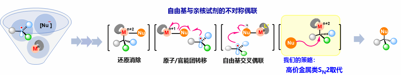 自由基化学作为有机化学的重要分支,在化学、物理、医药、材料科学等诸多领域具有广泛应用,并发挥着关键作用。随着过渡金属催化及光/电合成技术的不断进步,过渡金属与光催化的自由基反应已发展成为构建新化学键的多功能平台,为现代有机合成中快速、高选择性地构筑和修饰结构多样的化合物提供了重要工具,展现出显著的合成价值。然而,由于自由基具有高反应活性、寿命短及背景反应强等特点,如何控制其立体化学并实现高对映选择性转化,一直是合成化学中极具挑战性的课题。近年来,通过化学家的持续探索,过渡金属催化的不对称自由基反应取得了突破性进展,涌现出多种有效策略来实现自由基中间体的高立体化学控制。其中,以还原消除和原子/官能团转移为代表的策略尤为突出,为自由基与亲核试剂(Nu)之间的直接不对称偶联提供了可行路径,极大地推动并丰富了自由基化学的研究内容。然而,从反应机制角度分析,上述策略均要求亲核试剂首先与过渡金属中心发生配位或成键,形成有机金属中间体[L*M–Nu],随后再与碳自由基反应,从而实现对映选择性C–Nu键的构建。这一过程不可避免地限制了可参与反应的亲核试剂类型,成为当前方法学的一个主要局限。