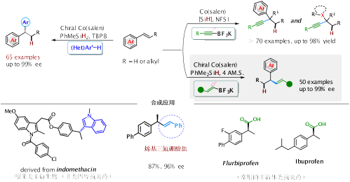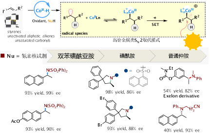 近日,我院张前教授、张鸽副教授团队在不对称自由基化学研究领域取得系列研究新进展。研究团队通过钴氢介导的氢原子转移与自由基-极性交叉相结合,建立了手性Salen/钴催化对映选择性氢化官能化反应体系,发展了基于“高价金属亲核取代”实现自由基与亲核试剂的不对称偶联新策略,实现了系列新颖的钴催化的不饱和烃与亲核试剂的不对称转化新模式。该方法可以通过自由基反应体系中游离的亲核试剂直接进攻有机金属中间体C–M键,为对映选择性的C–Nu构建提供一种新颖、高效的策略,大大拓展了不对称自由基反应中亲核试剂的种类,推动了自由基化学的发展。相关研究成果相继发表在德国应用化学(Angew. Chem., Int. Ed.)、中国化学会旗舰期刊CCS Chem.等国际期刊上。