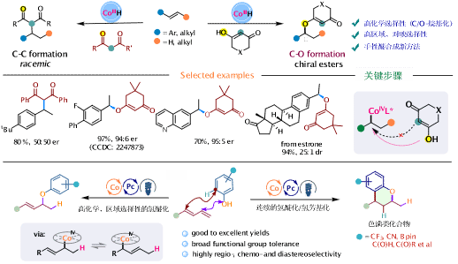 基于该策略,研究团队成功实现了烯烃与环状1,3-二酮衍生物的高化学、区域及对映选择性氢醚化反应,高效构建了手性C–O键(Chem. Catal. 2024, 4, 101126)。该反应具有良好的立体控制效果与广泛的官能团耐受性,不仅适用于苯乙烯类底物,也能拓展至非活化烯烃,为结构多样的手性烷基烯基醚衍生物的合成提供了高效路径。尤为重要的是,非活化烯烃的成功转化,为更具挑战性的普通仲烷基自由基的高对映选择性控制奠定了基础。团队进一步开发了一种新型钴催化选择性与发散性氢醚化反应,通过光/钴协同催化体系,实现了1,3-二烯与简单酚类底物的高效、高选择性醚化及连续的氢醚化/氢芳基化反应,合成了一系列烯丙基芳基醚以及具有重要药用价值的色满衍生物。该转化在药物化学与生物医学领域展现出良好的应用潜力。该研究拓展了钴介导的高价金属策略在C–O键构建中的应用范围,为杂环分子的设计与合成提供了新思路与发展机遇。相关成果以“A Photo- and Cobalt-Catalyzed Highly Selective and Divergent Hydrofunctionalization of 1,3-Dienes with Phenols”为题,发表于国际知名期刊Chemical Science。我校yl88858永利集团硕士研究生汪越为第一作者,张鸽副教授为通讯作者。
