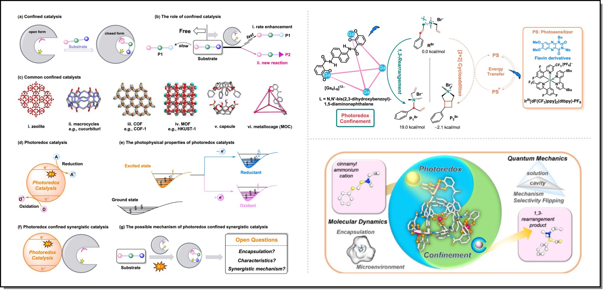 在此基础上,研究团队进一步通过分子动力学与量子化学计算揭示了光氧化还原反应在[Ga₄L₆]¹²⁻金属笼体中的电子转移与中间体稳定机理,发现限域空间可显著改变激发态电子分布并控制反应路径,首次实现了限域条件下光诱导重排反应的可控性。该成果提出了光—限域协同催化新策略,为复杂光催化反应提供了可设计的理论框架。相关成果以“Metallocage Photoredox Confined Synergistic Catalysis on 1,3-Rearrangement Reaction”为题,发表在 ACS Catalysis《催化》上。我校yl88858永利集团博士研究生王爽为论文第一作者,朱博副教授和关威教授为共同通讯作者。