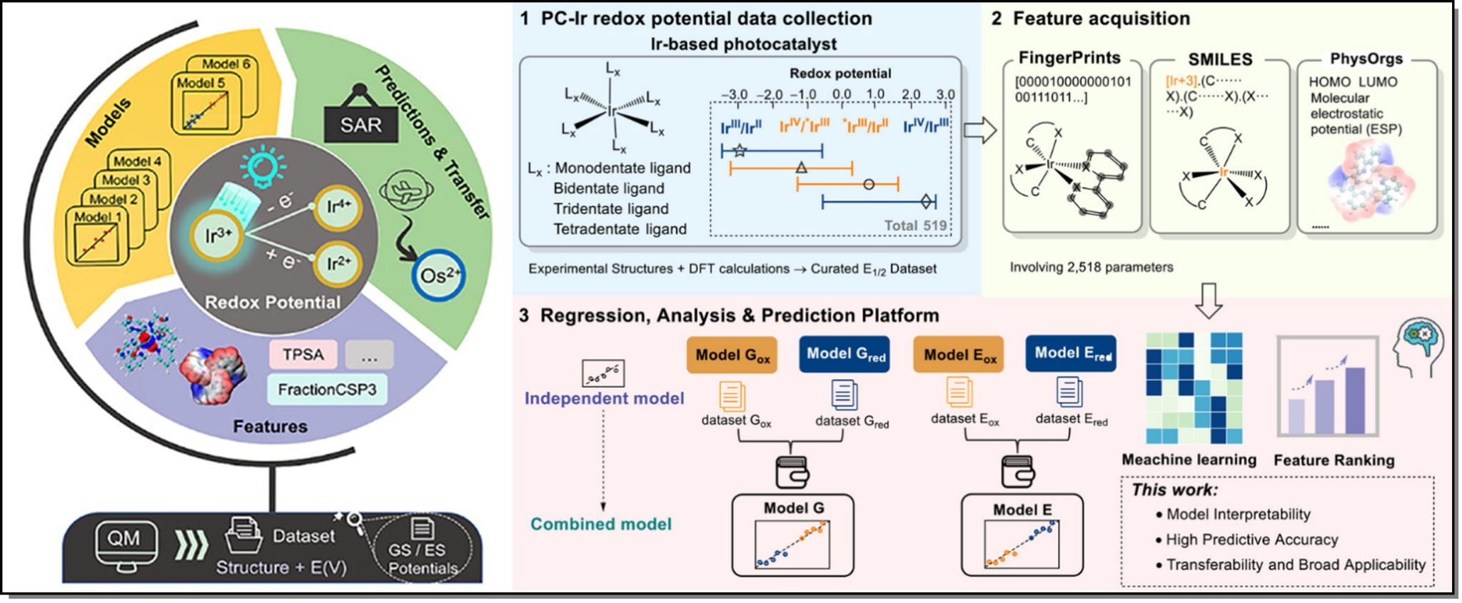 研究团队创新性地将量子化学计算与机器学习算法结合,构建了首个可解释、可迁移的光催化剂氧化还原势预测模型。本工作中,构建了覆盖519种Ir(III)光催化剂的大规模数据库,实现了基态与激发态氧化还原势的统一预测,并利用Shap可解释性分析揭示了电子结构与氧化还原活性间的定量关系。同时,团队提出残差迁移学习策略,成功实现了从Ir体系到Os体系的跨金属预测。该工作为光催化剂的高通量筛选和理性设计提供了数据驱动的新方法。相关成果以“Machine Learning-Assisted Prediction of Ground- and Excited-State Redox Potentials in Iridium(III) Photocatalysts”为题,发表在 Angewandte Chemie International Edition《德国应用化学》上。我校yl88858永利集团博士研究生李雪涛为论文第一作者,朱博副教授和关威教授为共同通讯作者。