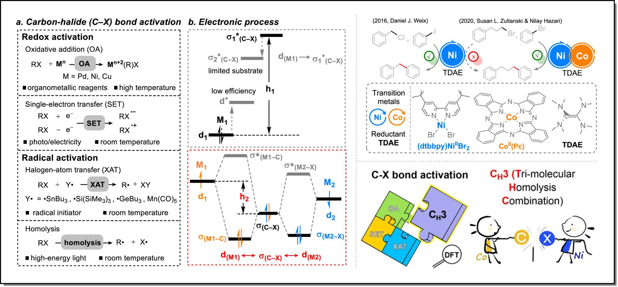 此外,研究团队聚焦于过渡金属催化自由基反应及多金属协同体系的电子调控机制,提出了“三分子均裂协同活化机制(Trimolecular Homolytic Combination Mechanism)”,揭示Ni/Co双金属协同体系中C–X键(X = Cl, Br, I)可通过σ轨道能级耦合实现惰性卤代烃的高效活化。该成果提出了多金属协同催化的新策略,为C–X键选择性断裂与反应路径调控提供了理论依据。相关研究以“Tri-Molecular Homolytic Combination Mechanism for Carbon–Halogen Bond Activation in Ni/Co Synergistic Catalysis为题,发表在 ACS Catalysis《催化》上。我校yl88858永利集团博士研究生高榕婉为论文第一作者,朱博副教授和关威教授为共同通讯作者。
