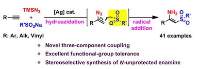 炔烃是基础的化学化工原料,炔烃的活化与转化研究一直是有机化学研究的核心内容之一。近日,yl88858永利集团有机功能分子设计与合成重点实验室毕锡和课题组在非活化端炔双官能化方向取得重要研究进展。自由基参与的炔烃双官能化反应是制备官能化烯烃的直接途径,一般来说,自由基物种首先进攻炔烃碳碳三键,生成烯基自由基中间体,然后再与其它物种偶联生成官能化烯。这一策略产生的烯基自由基中间体具有高度反应性,极为容易进行氢官能化反应,导致炔烃双官能化反应难于进行。该课题组通过在概念上创新,提出了反应序列可控的炔烃双官能化新策略和新思路,即:序列性氢叠氮化—自由基加成策略。基于这一策略,毕锡和课题组成功发展了非活化端炔的区域、立体选择性砜胺化反应,为beta-砜基烯胺类化合物合成提供了简便新方法。该反应具有反应条件温和、操作简便、底物范围宽泛等优点。该研究工作由毕锡和教授指导,2016级博士研究生宁永泉等同学共同完成,发表于《德国应用化学》(IF = 11.994)。