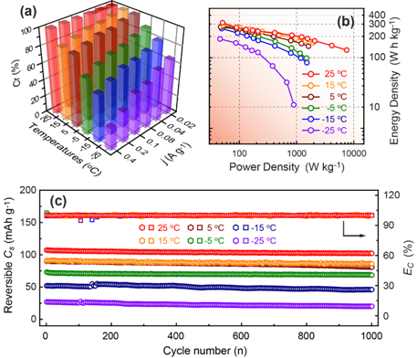 图2.3DSG//NVPOF钠离子全电池的低温储能性能:(a)容量保持率随电流密度和温度的变化情况;不同温度下(b)功率密度和能量密度之间的关系以及(c)循环稳定性能。