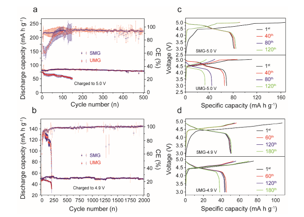 图2. (a, b) 5.0 V (a)和4.9 V (b)的上截止电压和200 mA g-1的电流密度下,Li//SMG和Li//UMG的循环性能图;(c, d) 在5.0 V (c)和4.9 V (d)的上截止电压和200 mA g-1的电流密度下,不同循环圈数时Li//SMG和Li//UMG的充放电曲线图。