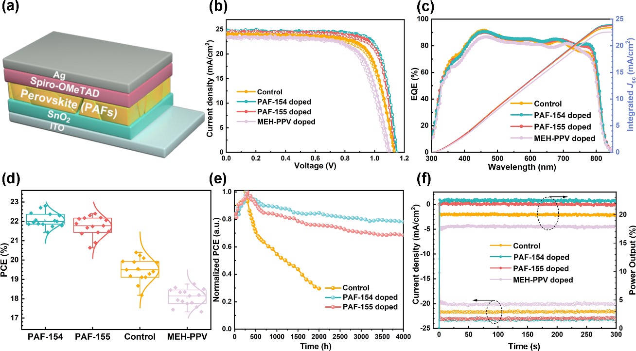 钙钛矿太阳能电池是目前最成功的光伏器件之一,在过去的十几年里,其能量转换效率从3.8%迅速提高到25.7%,发展之迅速令众多薄膜太阳能电池望尘莫及。实现钙钛矿太阳能电池的商业化,还需进一步提高器件的效率和长期稳定性。在钙钛矿中添加其他功能助剂是器件效率和稳定性提升的有效途径,多孔芳香骨架材料(PAFs)是一类重要的多孔有机聚合物,通常通过不可逆的偶联反应合成。PAF材料的全碳骨架结构使其对酸、碱和潮湿环境具有超高的稳定性,因此将PAFs作为添加剂应用于钙钛矿太阳能电池有望同时提高器件性能和稳定性。然而传统PAFs是芳香构筑基元通过sp3碳节点连接而成,其不连续的共轭结构不利于钙钛矿太阳能电池的电荷传输。