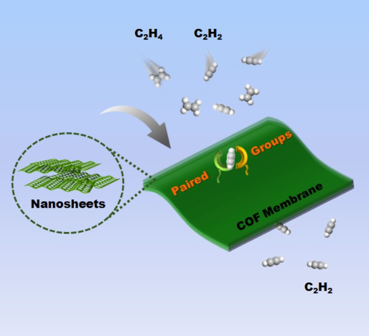 乙烯是石油化工产品聚乙烯的重要原料,生产乙烯过程中常伴随着乙炔的产生,然而乙炔的存在将毒化乙烯聚合催化剂,严重影响聚乙烯产品纯度;因此,乙炔/乙烯分离显得十分重要。传统分离方法依赖于能量密集型技术,例如:低温蒸馏;发展多孔膜材料并进行膜分离有望实现低能耗、高效率分离乙炔/乙烯。近年来,共价有机骨架(COF)因其孔道结构可设计、稳定性高且易于成膜等特性,成为多孔材料及膜材料领域的一个科学前沿。目前已报道的COF膜材料普遍存在乙炔分子识别能力不足的问题,从而导致乙炔/乙烯分离选择性偏低。