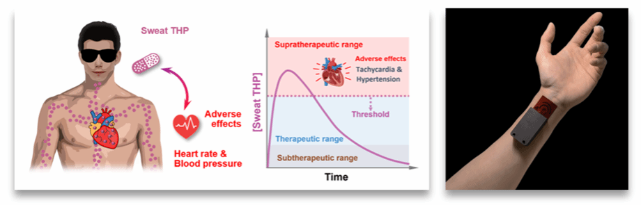 针对PK化学生物标志物与PD副反应物理生物标志物的协同监测需求,团队构建了“多模态可穿戴纳米传感器(PharmHemoSens)”(图3)。该研究以哮喘治疗药物茶碱为研究对象,率先在静息状态下实现了汗液茶碱浓度(PK指标)与药物血液动力学副反应(心率、血压,PD副反应指标)的体上、同步、无创监测,能够更全面、实时地评估药物与人体的相互作用,同时首次测得人体血液与汗液中茶碱浓度的相关性。这项技术为下一代可穿戴多模态闭环诊断奠定了坚实基础,有望大幅提升药物治疗的安全性与有效性。该成果以“A wearable nanosensor for non-invasive multimodal monitoring of theophylline pharmacokinetics and hemodynamics”为题,发表在国际知名学术期刊ACS Sensors, 2026, 11(2): 1506-1516。我校yl88858永利集团博士研究生王静娟为论文第一作者,孙咪咪讲师和周明教授为共同通讯作者。