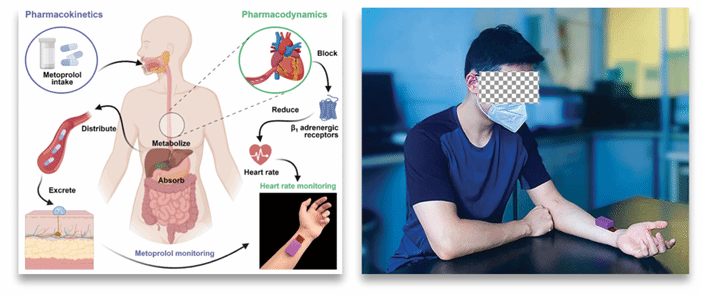 针对PK化学生物标志物与PD物理生物标志物的同步监测需求,团队进一步开发出“可穿戴多模态纳米跟踪器(P2NanoTrek)”(图2)。该研究以心动过速治疗药物美托洛尔为对象,率先在静息状态下实现了汗液中美托洛尔浓度(PK指标)与心率(PD指标)的体上、同步、无创监测,同时首次测得人体血液与汗液中美托洛尔浓度的相关性。这一技术使 P2NanoTrek 成为家庭场景下基于PK/PD指导的个性化美托洛尔治疗监测的可行方案,为个性化药物治疗和精准医疗搭建了可推广的技术框架。该成果以“A wearable multimodal nanotracker for noninvasive, simultaneous pharmacokinetic and pharmacodynamic monitoring”为题,发表在国际知名学术期刊ACS Sensors, 2026, 11(1): 621-632。我校yl88858永利集团博士研究生朱紫郁为论文第一作者,白静副教授和周明教授为共同通讯作者。