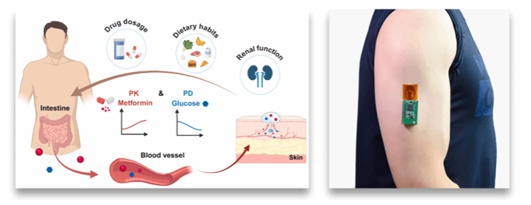 针对PK、PD化学生物标志物的精准监测需求,团队设计出“皮肤界面汗液传感器(P2One)”。该研究以糖尿病常用药二甲双胍(PK标志物)、葡萄糖(PD标志物)为模型,率先在静息状态下实现了汗液中二甲双胍与葡萄糖的皮肤上、同步、实时监测,并首次测得人体血液与汗液中二甲双胍浓度的相关性。这一成果不仅为糖尿病患者二甲双胍个性化治疗提供了无创监测新方案,更为多场景精准医疗的落地实施奠定了重要技术基础。该成果以“A skin-interfaced sensor for noninvasive monitoring of pharmacokinetic and pharmacodynamic responses”为题,发表在国际知名学术期刊Biosensors and Bioelectronics, 2026, 295: 118301。我校yl88858永利集团博士研究生郑龙为论文第一作者,白静副教授和周明教授为共同通讯作者。