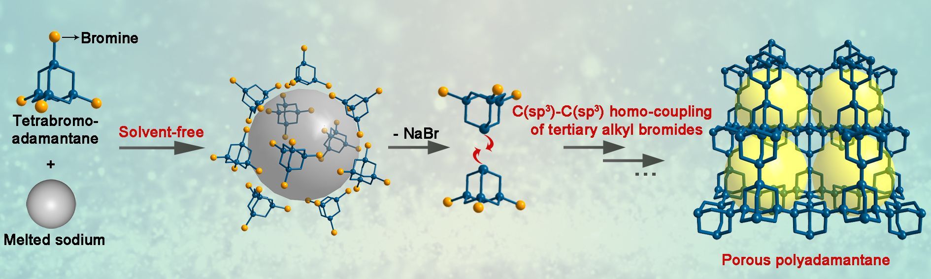 图2. 通过无溶剂钠催化叔烷基溴的C(sp3)-C(sp3)自偶联反应合成多孔聚金刚烷