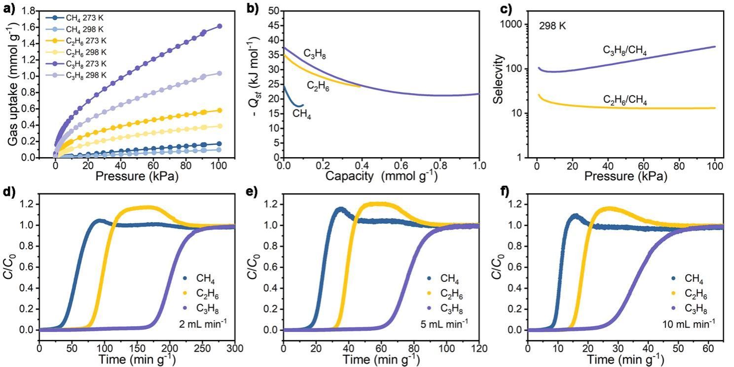 图3. 多孔聚金刚烷对甲烷/乙烷/丙烷的静态吸附性能以及混合气体的动态分离性能